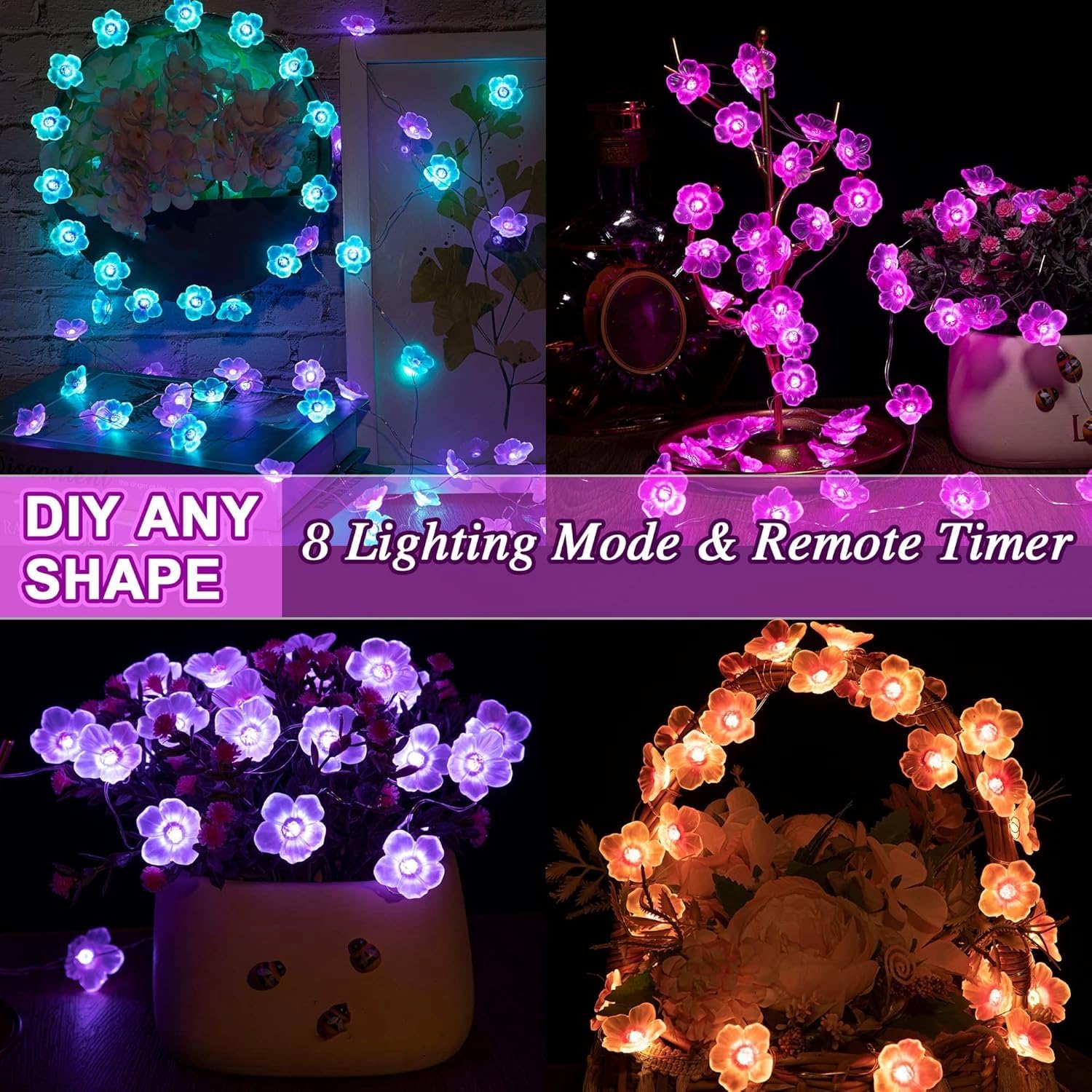 - 8 Lighting Mode and Remote Timer: the multicolor cherry blossom LED lights to provide 4H/ 6H/ 8H timing function; Easily select colors and flash modes with the remote, and the cherry blossom fairy lights have a memory function that can remember the mode and color set last time, good value