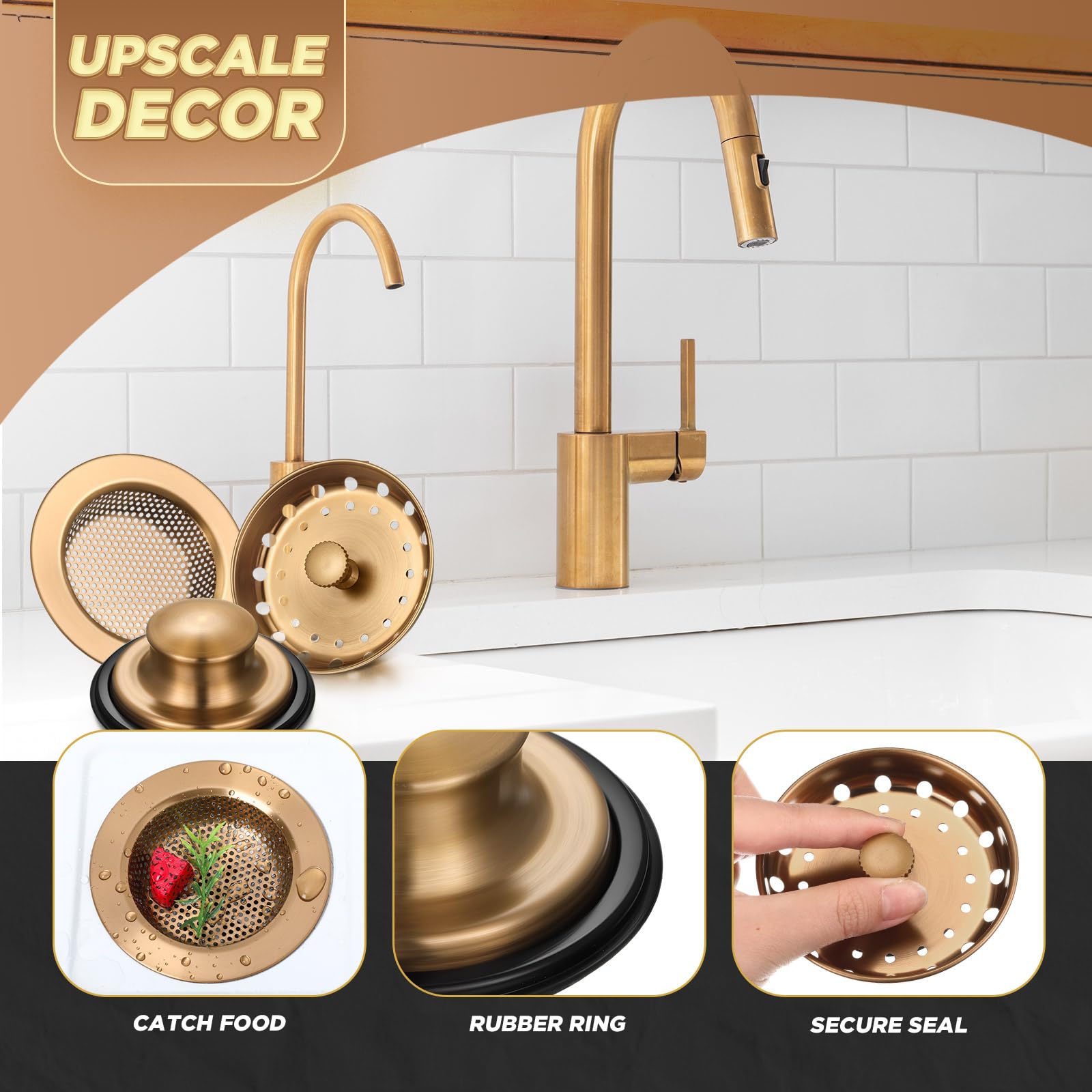 Mudder 3 Pcs Kitchen Sink Drain Strainer and Stopper Stainless Steel Garbage Disposal Plug with Handle Universal Anti-Clogging Kitchen Sink Filter Sieve Basket Strainer (Champagne Bronze)