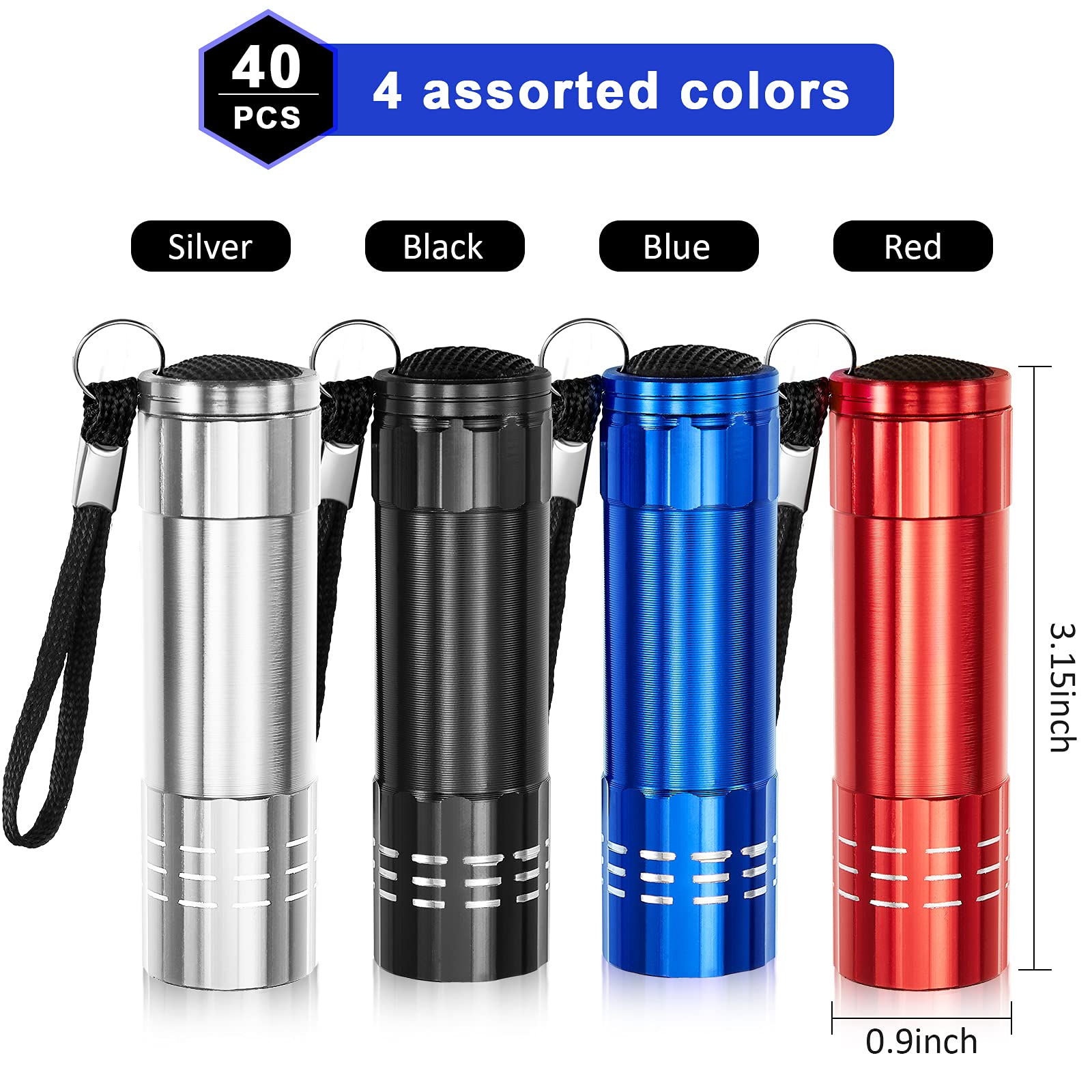 - Sufficient quantity: you will get 40 pieces of 9 LED mini flashlights in 4 different colors, including black, blue, red and silver, and each color has 10 pieces, the lights use 3 AAA battery ( the package not included), ample quantity and various colors are enough to use and replacement for you