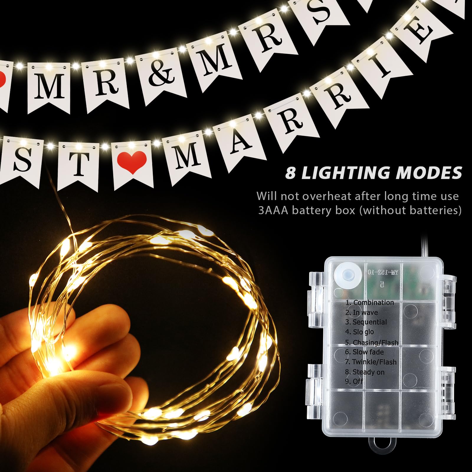- Wedding banner set: you will get 2 pieces of wedding banners which consist of 20 pieces of white card stocks painted with black letters showing MR and MRS JUST MARRIED and red heart patterns; 2 pieces of 6.5 feet fairy string lights to string the banner together, creating a happy and sweet atmosphere.The battery model is 3AAA.